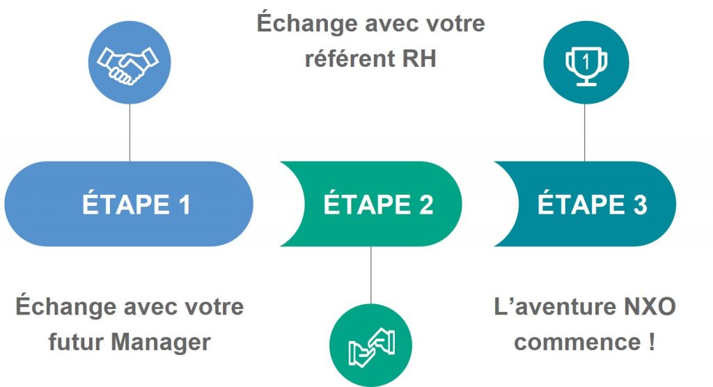 Après votre candidature, deux entretiens nous permettent d’en savoir plus sur vos aspirations professionnelles et sur votre parcours. Ils vous permettront de vous projeter et d’être sûr que vos attentes soient en adéquation avec celles de NXO.