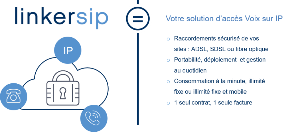 La solution linkerSIP vous permet de centraliser lâensemble de vos accĂšs TĂ©lĂ©com voix (analogiques, T0, T2) au travers un trunk SIP unique basĂ© sur une liaison SDSL garantie dĂ©diĂ©e Ă la voix.