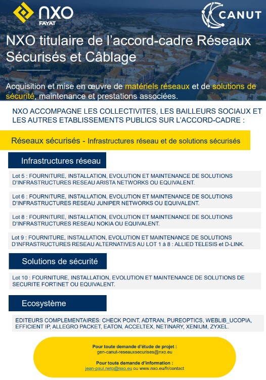 NXO est titulaire de l’accord-cadre CANUT “Réseaux sécurisés & Câblage” pour le secteur public (collectivités, santé, bailleurs, établissements publics) : acquisition, intégration et maintenance d’infrastructures réseau et de solutions de sécurité, avec couverture nationale.